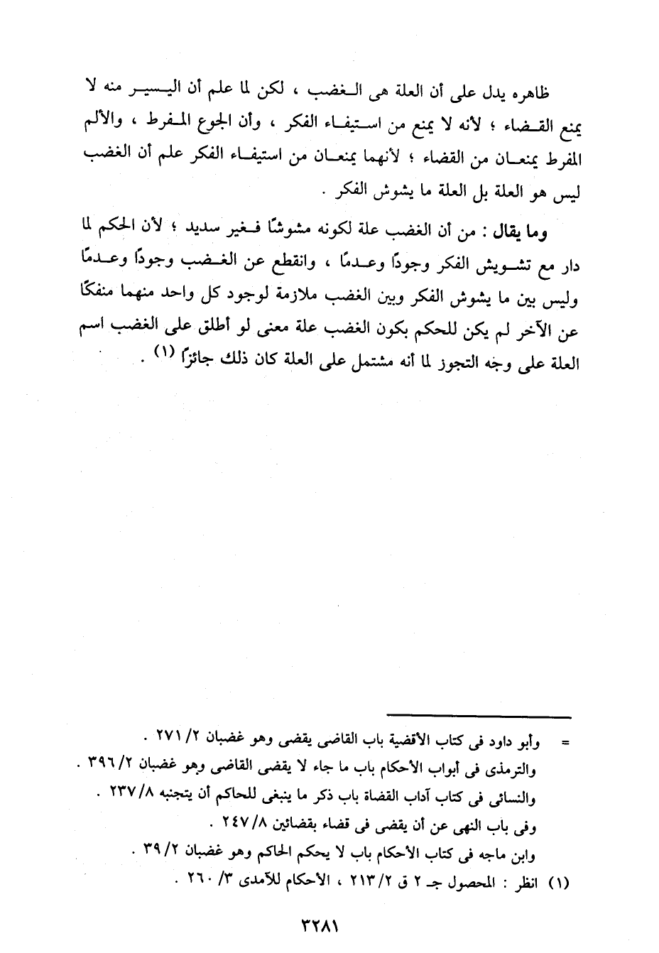 ظاهره يدل على أن العلة هي الغضب، لكن لما علم أن اليسير منه لا يمنع القضاء؛ لأنه لا يمنع من استيفاء الفكر، وأن الجوع المفرط، والألم المفرط يمنعان من القضاء؛ لأنهما يمنعان من استيفاء الفكر علم أن الغضب ليس هو العلة بل العلة ما يشوش الفكر.