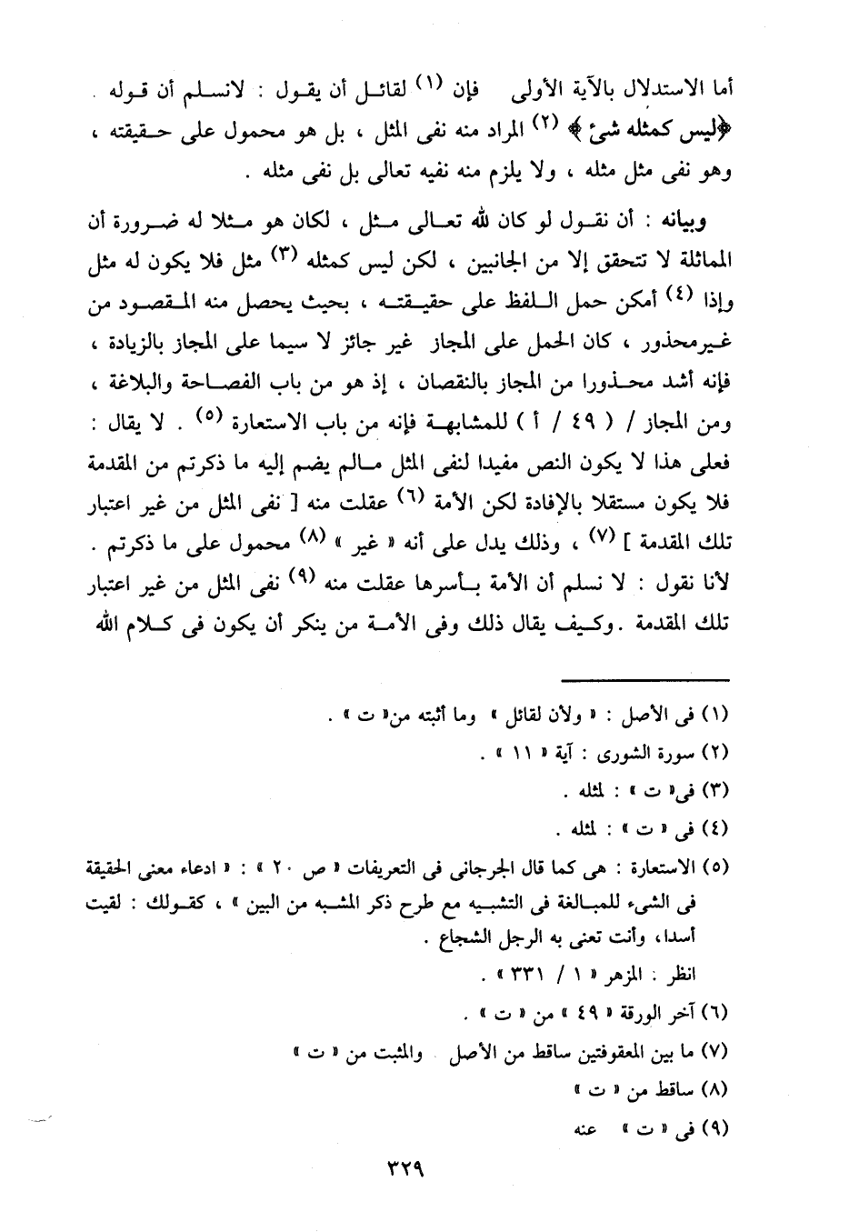أما الاستدلال بالآية الأولى فإن لقائل أن يقول: لا نسلم أن قوله {ليس كمثله شيء} المراد منه نفي المثل، بل هو محمول على حقيقته، وهو نفي مثل مثله، ولا يلزم منه نفيه تعالى بل نفي مثله.