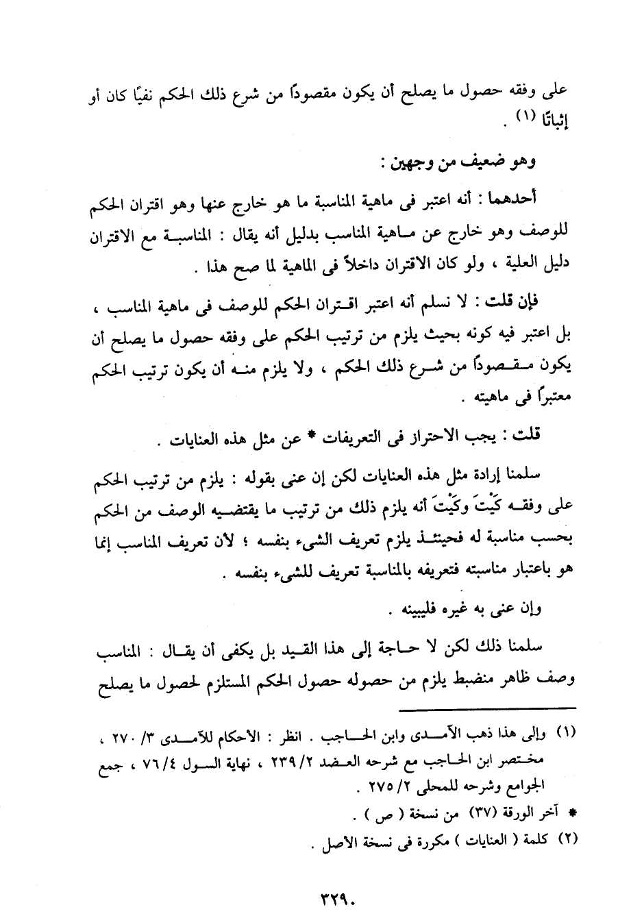 سلمنا إرادة مثل هذه العنايات لكن إن عنى بقوله: يلزم من ترتيب الحكم على وفقه كيت وكيت أنه يلزم ذلك من ترتيب ما يقتضيه الوصف من الحكم بحسب مناسبة له فحينئذ يلزم تعريف الشيء بنفسه؛ لأن تعريف المناسب إنما هو باعتبار مناسبته فتعريفه بالمناسبة تعريف للشيء بنفسه.