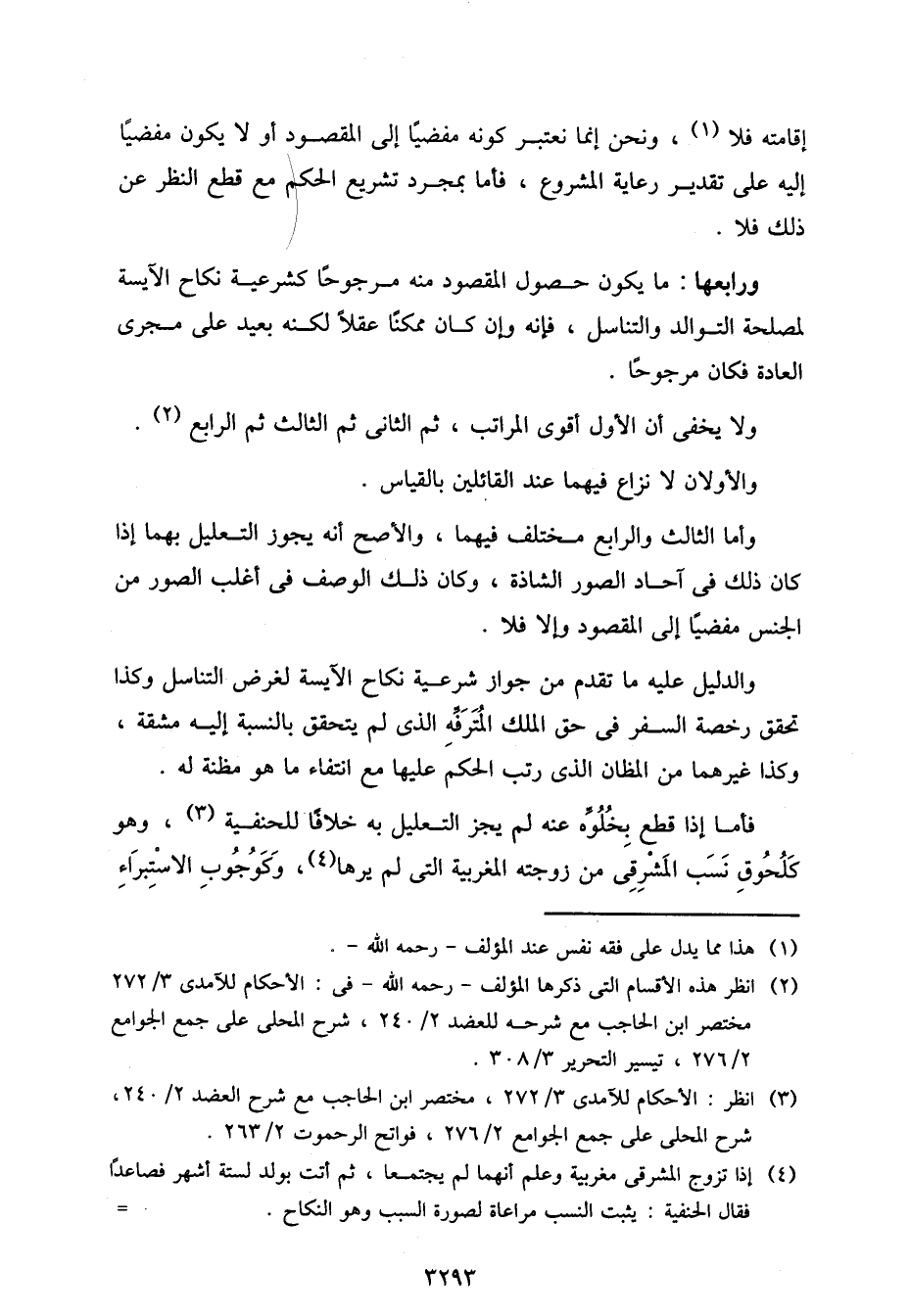 ورابعها: ما يكون حصول المقصود منه مرجوحًا كشرعية نكاح الآيسة لمصلحة التوالد والتناسل، فإنه وإن كان ممكنًا عقلًا لكنه بعيد على مجرى العادة فكان مرجوحًا.