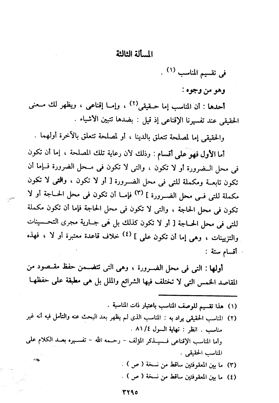 أما الأول فهو على أقسام: وذلك لأن رعاية تلك المصلحة، إما أن تكون في محل الضرورة أو لا تكون، والتي لا تكون في محل الضرورة فإما أن تكون تابعة ومكملة للتي في محل الضرورة [أو لا تكون، والتي لا تكون مكملة للتي في محل الضرورة] فإما أن تكون في محل الحاجة أو لا تكون في محل الحاجة، والتي لا تكون في محل الحاجة فإما أن تكون مكملة للتي في محل الحاجة [أو لا تكون كذلك بل هي جارية مجرى التحسينات والتزيينات، وهي إما أن تكون على] خلاف قاعدة معتبرة أو لا، فهذه أقسام ستة: