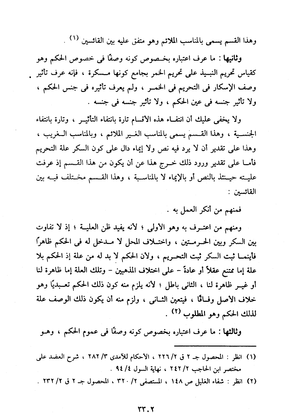 ومنهم من اعترف به وهو الأولي؛ لأنه يفيد ظن العلية؛ إذ لا تفاوت بين السكر وبين الحرمتين، واختلاف المحل لا مدخل له في الحكم ظاهرًا فأينما ثبت السكر ثبت التحريم، ولأن الحكم لا بد له من علة إذ الحكم بلا علة إما ممتنع عقلًا أو عادةً- على اختلاف المذهبين- وتلك العلة إما ظاهرة لنا أو غير ظاهرة لنا، الثاني باطل؛ لأنه يلزم منه كون ذلك الحكم تعبديًا وهو خلاف الأصل وفاقًا، فيتعين الثاني، ولزم منه أن يكون ذلك الوصف علة لذلك الحكم وهو المطلوب.