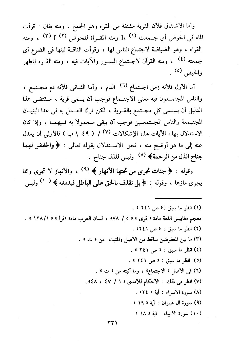 أما الأول فلأنه زمن اجتماع الدم، وأما الثاني فلأنه دم مجتمع، والناس المجتمعون فيه معنى الاجتماع فوجب أن يسمى قرية، مقتضى هذا الدليل أن يسمى كل مجتمع بالقرية، لكن ترك العمل به في عدا البنيان المجتمعة والناس المجتمعين فوجب أن يبقى معمولا به فيهما، وإذا كان الاستدلال بهذه الآيات هذه الإشكالات / (49/ب) فالأولى أن يعدل عنه إلى ما هو أوضح منه، نحو الاستدلال بقوله تعالى: {واخفض لهما جناح الذل من الرحمة} وليس للذل جناح.