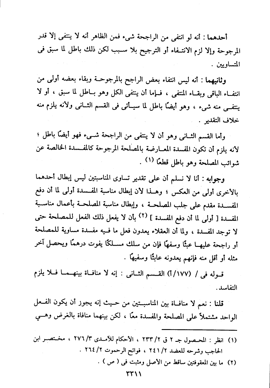 وأما القسم الثاني وهو أن لا ينتفي من الراجحة شيء فهو أيضًا باطل؛ لأنه يلزم أن تكون المفسدة المعارضة بالمصلحة المرجوحة كالمفسدة الخالصة عن شوائب المصلحة وهو باطل قطعًا.