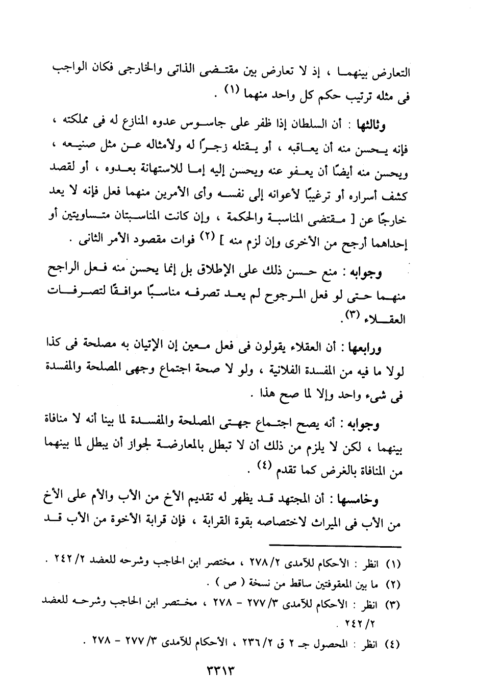 وثالثهما: أن السلطان إذا ظفر على جاسوس عدوه المنازع له في مملكته، فإنه يحسن منه أن يعاقبه، أو يقتله زجرًا له ولأمثاله عن مثل صنيعه، ويحسن منه أيضًا أن يعفو عنه ويحسن إليه إما للاستهانة بعدوه، أو لقصد كشف أسراره أو ترغيبًا لأعوانه إلى نفسه وأي الأمرين منهما فعل فإنه لا يعد خارجًا عن [مقتضي المناسبة والحكمة، وإن كانت المناسبتان متساويتين أو إحداهما أرجح من الأخرى وإن لزم منه] فوات مقصود الأمر الثاني.