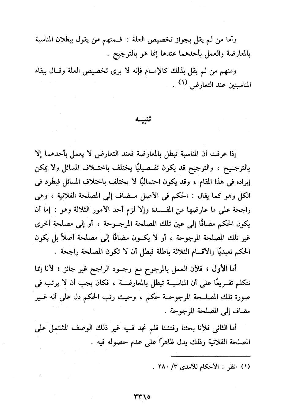 ومنهم من لم يقل بذلك كالإمام فإنه لا يرى تخصيص العلة وقال ببقاء المناسبتين عند التعارض.