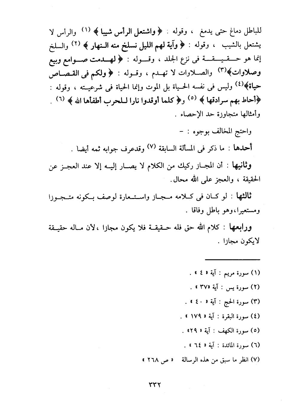 ورابعها: كلام الله حق فله حقيقة فلا يكون مجازا، لأن ما له حقيقة لا يكون مجازا.