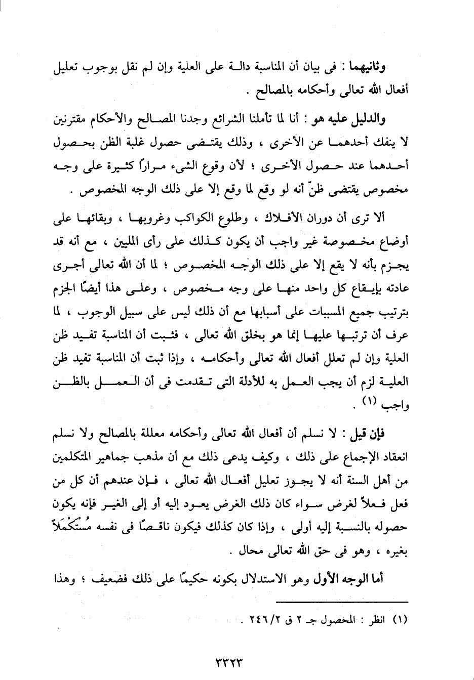ألا ترى أن دوران الأفلاك، وطلوع الكواكب وغروبها، وبقائها على أوضاع مخصوصة غير واجب أن يكون كذلك على رأى المليين، مع أنه قد يجزم بأنه لا يقع إلا على ذلك الوجه المخصوص؛ لما أن الله تعالى أجرى عادته بإيقاع كل واحد منها على وجه مخصوص، وعلى هذا أيضًا الجزم بترتيب جميع المسببات على أسبابها مع أن ذلك ليس على سبيل الوجوب، لما عرف أن ترتبها عليها إنما هو بخلق الله تعالى، فثبت أن المناسبة تفيد ظن العلية وإن لم تعلل أفعال الله تعالى وأحكامه، وإذا ثبت أن المناسبة تفيد ظن العلية لزم أن يجب العمل به للأدلة التي تقدمت في أن العمل بالظن واجب.