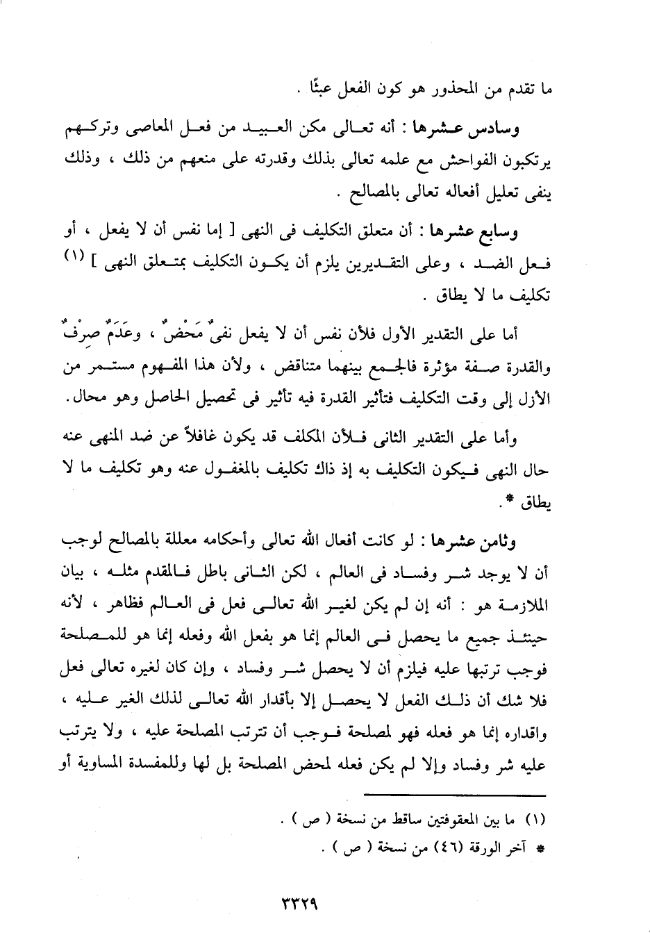 وثامن عشرها: لو كانت أفعال الله تعالى وأحكامه معللة بالمصالح لوجب أن لا يوجد شر وفساد في العالم، لكن الثاني باطل فالمقدم مثله، بيان الملازمة هو: أنه إن لم يكن لغير الله تعالى فعل في العالم فظاهر، لأنه حينئذ جميع ما يحصل في العالم إنما هو بفعل الله وفعله إنما هو للمصلحة فوجب ترتبها عليه فيلزم أن لا يحصل شر وفساد، وإن كان لغيره تعالى فعل فلا شك أن ذلك الفعل فلا يحصل إلا بأقدار الله تعالى لذلك الغير عليه، واقداره إنما هو فعله فهو لمصلحة فوجب أن تترتب المصلحة عليه، ولا يترتب عليه شر وفساد وإلا لم يكن فعله لمحض المصلحة بل لها وللمفسدة المساوية أو