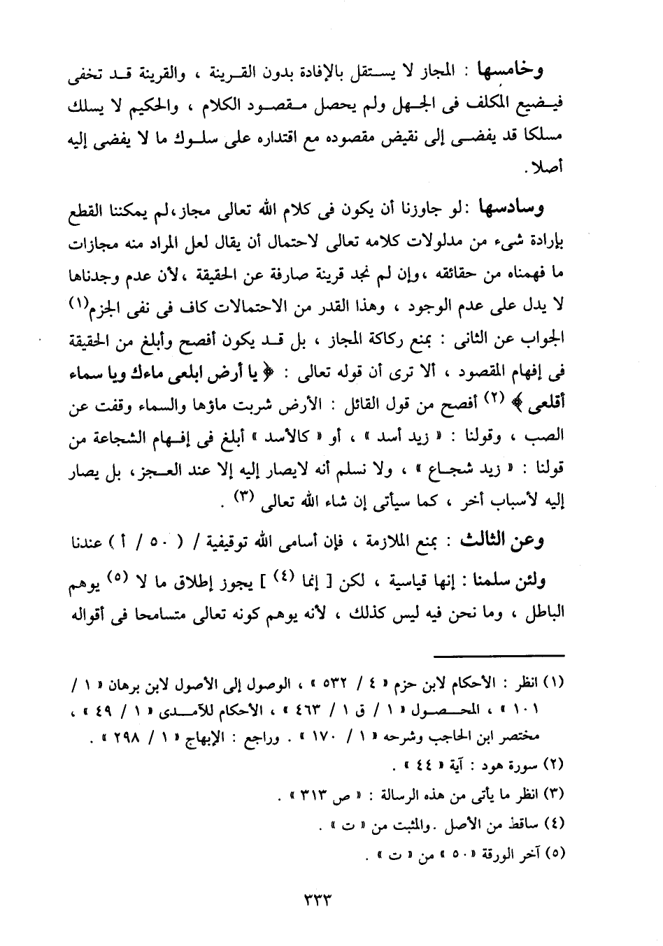 وسادسها: لو جاوزنا أن يكون في كلام الله تعالى مجاز، لم يمكننا القطع بإرادة شيء من مدلولات كلامه تعالى لاحتمال أن يقال لعل المراد منه مجازات ما فهمناه من حقائقه، وإن لم نجد قرينة صارفة عن الحقيقة، لأن عدم وجدناها لا يدل على عدم الوجود، وهذا القدر من الاحتمالات كاف في نفي الجزم
