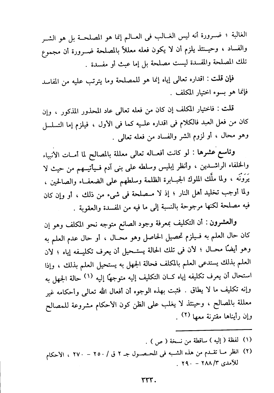 والعشرون: أن التكليف بمعرفة وجود الصانع متوجه نحو المكلف وهو إن كان حال العلم به فيلزم تحصيل الحاصل وهو محال، أو حال عدم العلم به وهو أيضًا محال؛ لأن في تلك الحالة يستحيل أن يعرف تكليفه إياه؛ لأن العلم بذلك يستدعى العلم بالمكلف فحالة الجهل به يستحيل العلم بذلك، وإذا استحال أن يعرف تكليفه إياه كان التكليف إليه متوجهًا إليه حالة الجهل به وإنه تكليف ما لا يطاق. فثبت بهذه الوجوه أن أفعال الله تعالى وأحكامه غير معللة بالمصالح، وحينئذ لا يغلب على الظن كون الأحكام مشروعة للمصالح وإن رأيناها مقترنة معها.