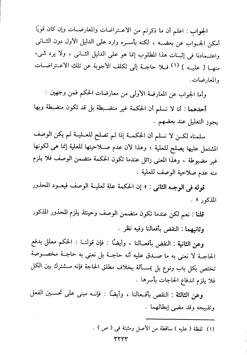وعن الثانية: النقض بأفعالنا، وأيضًا: فإن قولنا: الحكم معلل بدفع الحاجة لا نعني به ما صدق عليه أنه حاجة بل نعني به حاجة مخصوصة تختص بكل باب ونوع بل بمسألة بخلاف مطلق الحاجة فإنه مشترك بين الكل فلا يلزم اندفاع الحاجات بأسرها.