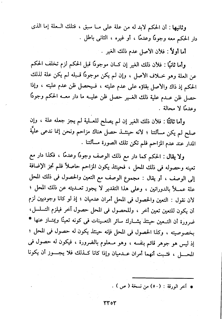 ولا يقال: الحكم كما دار مع ذلك الوصف وجودًا وعدمًا، فكذا دار مع تعينه وحصوله في ذلك المحل، فحينئذ يكون المزاحم حاصلًا فلم تجز الإضافة إلى الوصف، أو يقال: مجموع الوصف مع التعين والحصول في ذلك المحل على عملًا بالدورانين، وعلى هذا التقدير لا يجوز تعديته عن ذلك المحل؛ لأن نقول: التعين والحصول في المحل أمران عديمان؛ إذ لو كانا وجوديين لزم أن يكون للتعين تعين أخر، وللحصول في المحل حصول آخر فيلزم التسلسل، ضرورة أن التعين حينئذ يشارك سائر التعينات في كونه تعينًا ويمتاز عنها بخصوصيته، وكذا الحصول في المحل فإنه حينئذ يكون له حصول في المحل؛ إذ ليس هو جوهر قائم بنفسه، وهو معلوم بالضرورة، فيكون له حصول في المحل، فثبت أنهما أمران عديمان وإذا كانا كذلك فلا يجوز أن يكونا