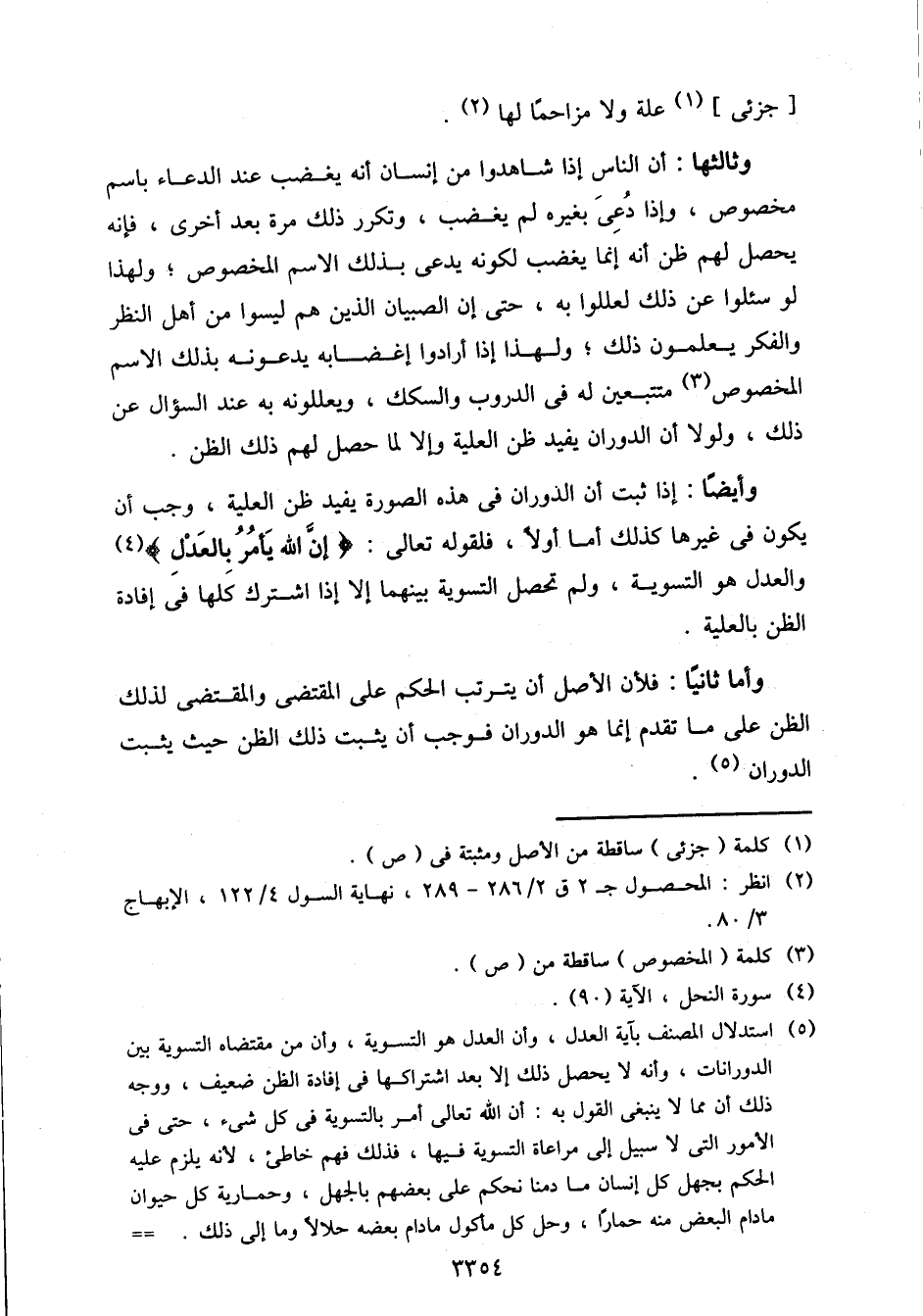 وأيضًا: إذا ثبت أن الدوران في هذه الصورة يفيد ظن العلية، وجب أن يكون في غيرها كذلك أما أولًا، فلقوله تعالى: {إن الله يأمر بالعدل} والعدل هو التسوية، ولم تحصل التسوية بينهما إلا إذا اشترك كلها في إفادة الظن بالعلية.