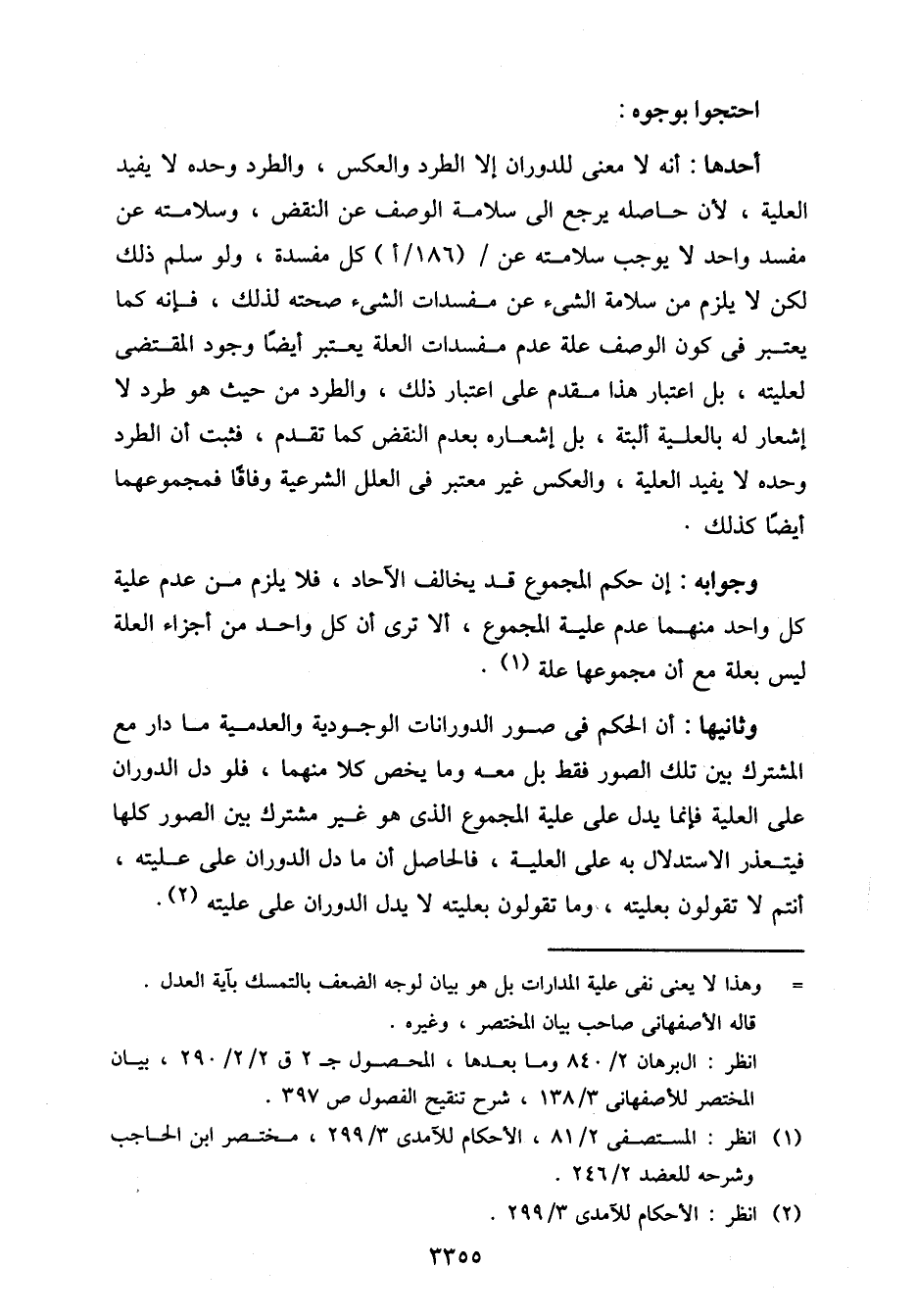وثانيها: أن الحكم في صور الدورانات الوجودية والعديمة ما دار مع المشترك بين تلك الصور فقط بل معه وما يخص كلا منهما، فلو دل الدوران على العلية فإنما يدل على علية المجموع الذي هو غير مشترك بين الصور كلها فيتعذر الاستدلال به على العلية، فالحاصل أن ما دل الدوران على عليته، أنتم لا تقولون بعليته، وما تقولون بعليته لا يدل الدوران على عليته.