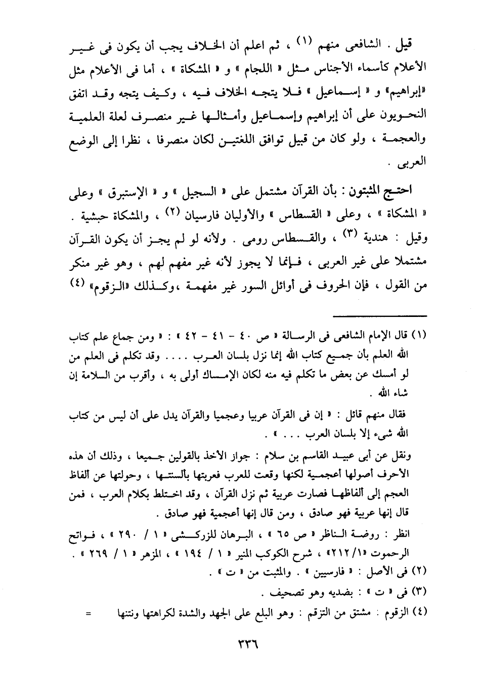 قيل. الشافعي منهم، ثم اعلم أن الخلاف يجب أن يكون في غير الأعلام كأسماء الأجناس مثل "اللجام" و "المشكاة"، أما في الأعلام مثل "إبراهيم" و "إسماعيل" فلا يتجه الخلاف فيه، وكيف يتجه وقد اتفق النحويون على أن إبراهيم وإسماعيل وأمثالها غير منصرف لعلة العلمية والعجمة، ولو كان من قبيل توافق اللغتين لكان منصرفا، نظرا إلى الوضع العربي.