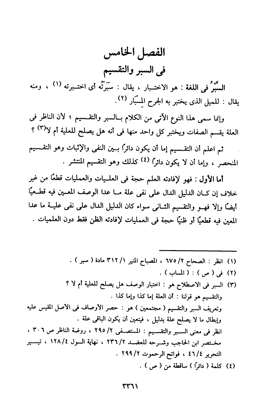 وإنما سمي هذا النوع الآتي من الكلام بالسبر والتقسيم؛ لأن الناظر في العلة يقسم الصفات ويختبر كل واحد منها في أنه هل يصلح للعلية أم لا؟