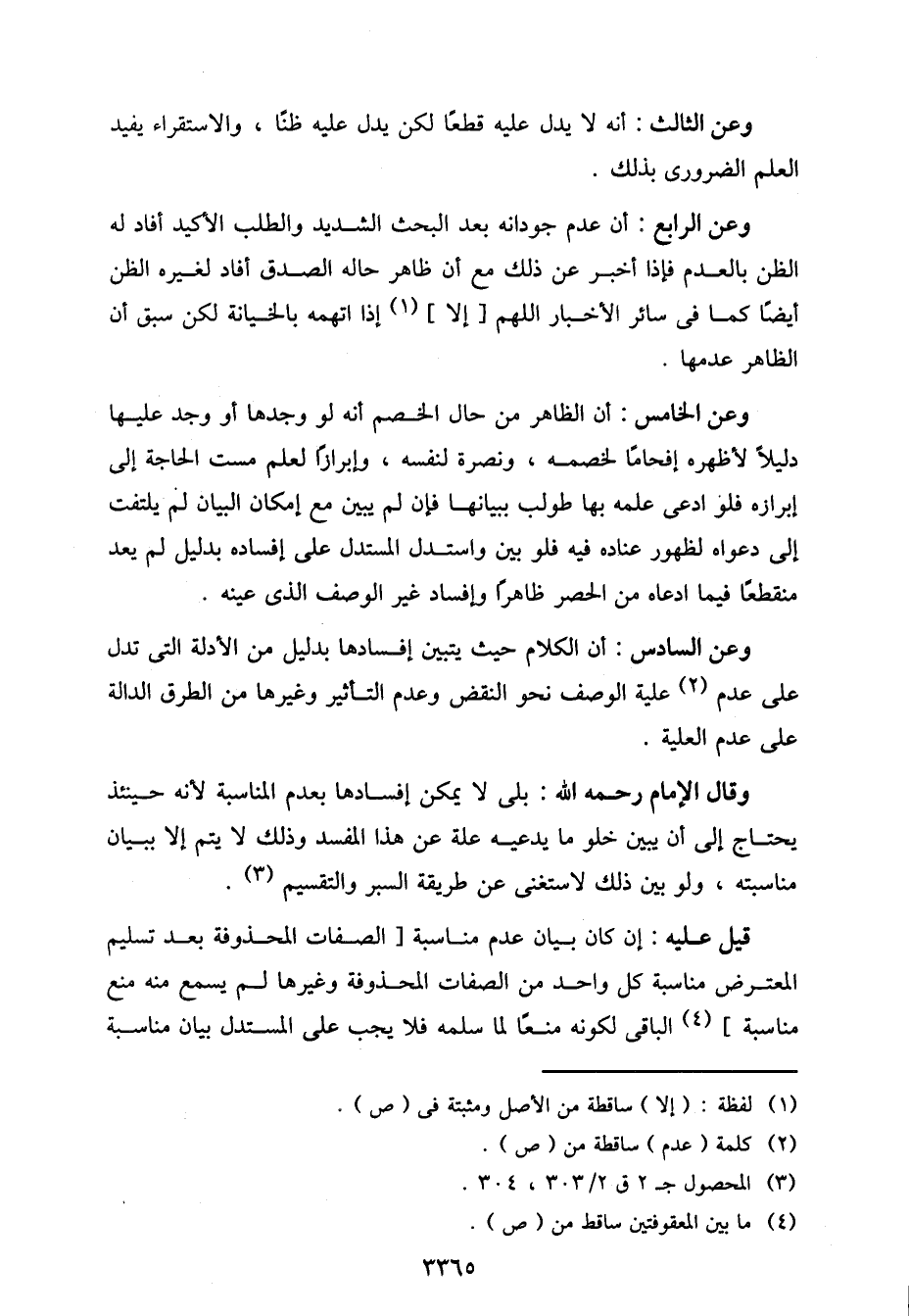 وعن الخامس: أن الظاهر من حال الخصم أنه لو وجدها أو وجد عليها دليلًا لأظهره إفحامًا لخصمه، ونصرة لنفسه، وإبرازًا لعلم مست الحاجة إلى إبرازه فلو ادعى علمه بها طولب ببيانها فإن لم يبين مع إمكان البيان لم يلتفت إلى دعواه لظهور عناده فيه فلو بين واستدل المستدل على إفساده بدليل لم يعد منقطعًا فيما ادعاه من الحصر ظاهرًا وإفساد غير الوصف الذي عينه.