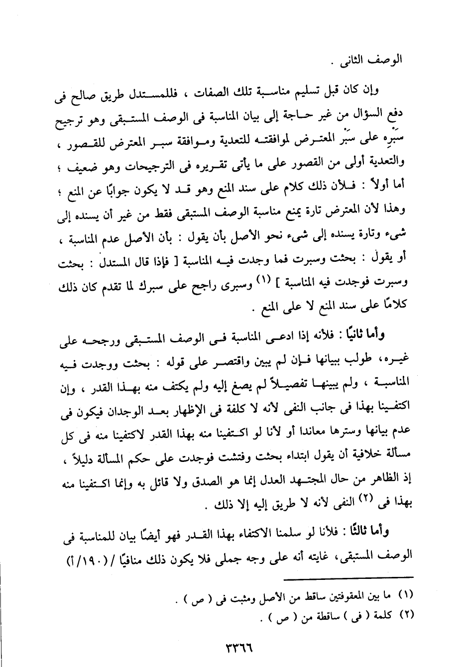 وأما ثانيًا: فلأنه إذا ادعى المناسبة في الوصف المستبقي ورجحه على غيره، طولب ببيانها فإن لم يبين واقتصر على قوله: بحثت ووجدت فيه المناسبة، ولم يبينها تفصيلًا لم يصغ إليه ولم يكتف منه بهذا القدر، وإن اكتفينا بهذا في جانب النفي لأنه لا كلفة في الإظهار بعد الوجدان فيكون في عدم بيانها وسترها معاندا أو لأنا لو اكتفينا منه بهذا القدر لاكتفينا منه في كل مسألة خلافية أن يقول ابتداء بحثت وفتشت فوجدت على حكم المسألة دليلًا، إذ الظاهر من حال المجتهد العدل إنما هو الصدق ولا قائل به وإنما اكتفينا منه بهذا في النفي لأنه لا طريق إليه إلا ذلك.