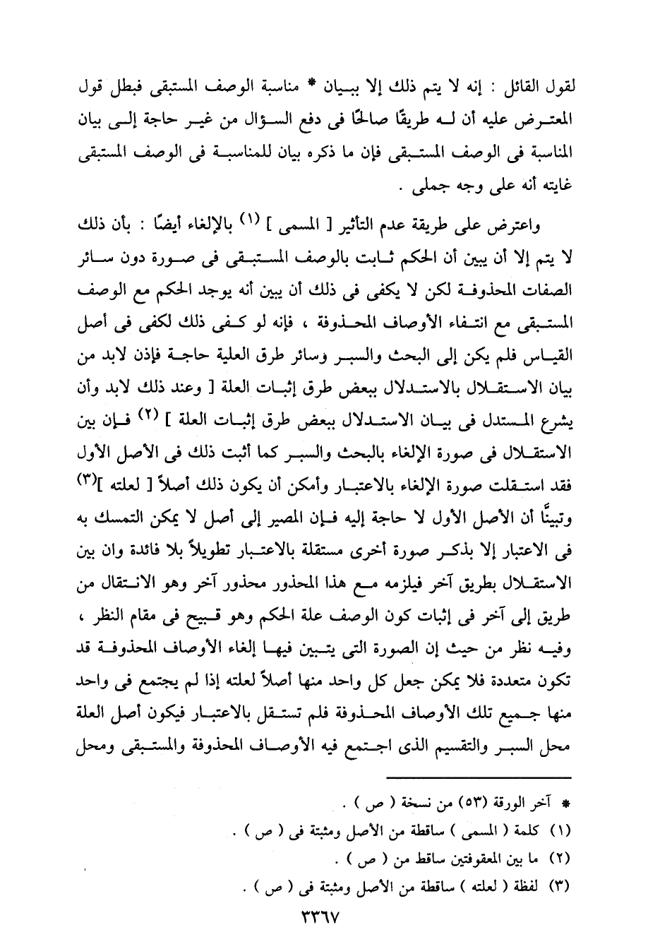 لقول القائل: إنه لا يتم ذلك إلا ببيان مناسبة الوصف المستبقى فبطل قول المعترض عليه أن له طريقًا صالحًا في دفع السؤال من غير حاجة إلى بيان المناسبة في الوصف المستبقي فإن ما ذكره بيان للمناسبة في الوصف المستبقي غايته أنه على وجه جملي.