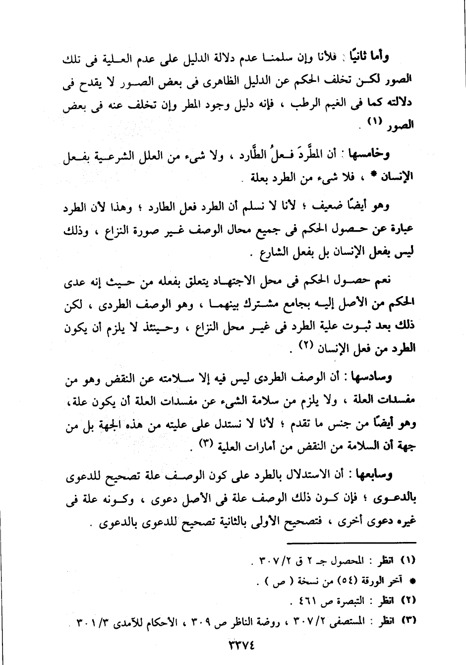 وسادسها: أن الوصف الطردي ليس فيه إلا سلامته عن النقض وهو من مفسدات العلة، ولا يلزم من سلامة الشيء عن مفسدات العلة أن يكون علة، وهو أيضًا من جنس ما تقدم؛ لأنا لا نستدل على عليته من هذه الجهة بل من جهة أن السلامة من النقض من أمارات العلية.
