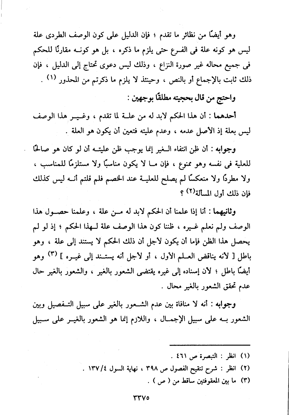 وثانيها: أنا إذا علمنا أن الحكم لابد له من علة، وعلمنا حصول هذا الوصف ولم نعلم غيره، ظننا كون هذا الوصف علة لهذا الحكم؛ إذ لو لم يحصل هذا الظن فإما أن يكون لأجل أن ذلك الحكم لا يستند إلى علة، وهو باطل [لأنه يناقض العلم الأول، أو لأجل أنه يستند إلى غيره] وهو أيضًا باطل؛ لأن إسناده إلى غيره يقتضي الشعور بالغير، والشعور بالغير حال عدم تحقق الشعور بالغير محال.