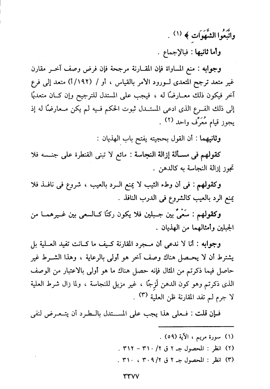 وجوابه: أنا لا ندعي أن مجرد المقارنة كيف ما كانت تفيد العلية بل يشترط أن لا يحصل هناك وصف آخر هو أولى بالرعاية، وهذا الشرط غير حاصل فيما ذكرتم من المثال فإنه حصل هناك ما هو أولى بالاعتبار من الوصف الذي ذكرتم وهو كون الدهن لزجًا، غير مزيل للنجاسة، ولما زال شرط العلية لا جرم لم تفد المقارنة ظن العلية.