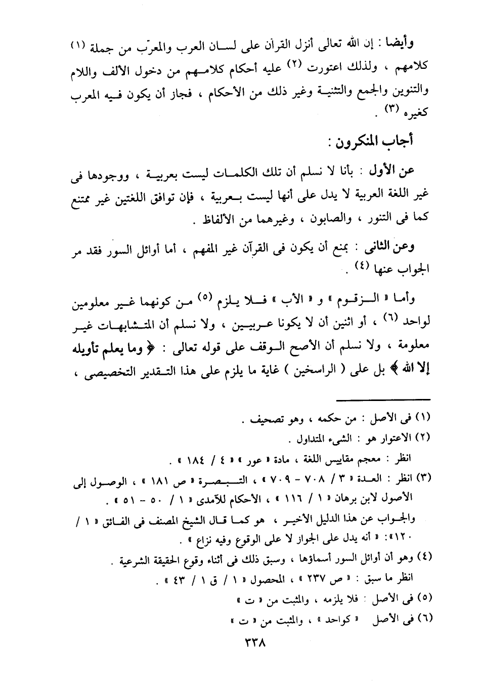 وأما "الزقوم" و "الأب" فلا يلزم من كونهما غير معلومين لواحد، أو اثنين أن لا يكونا عربيين، ولا نسلم أن المتشابهات غير معلومة، ولا نسلم أن الأصح الوقف على قوله تعالى: {وما يعلم تأويله إلا الله} بل على (الراسخين) غاية ما يلزم على هذا التقدير التخصيصي،