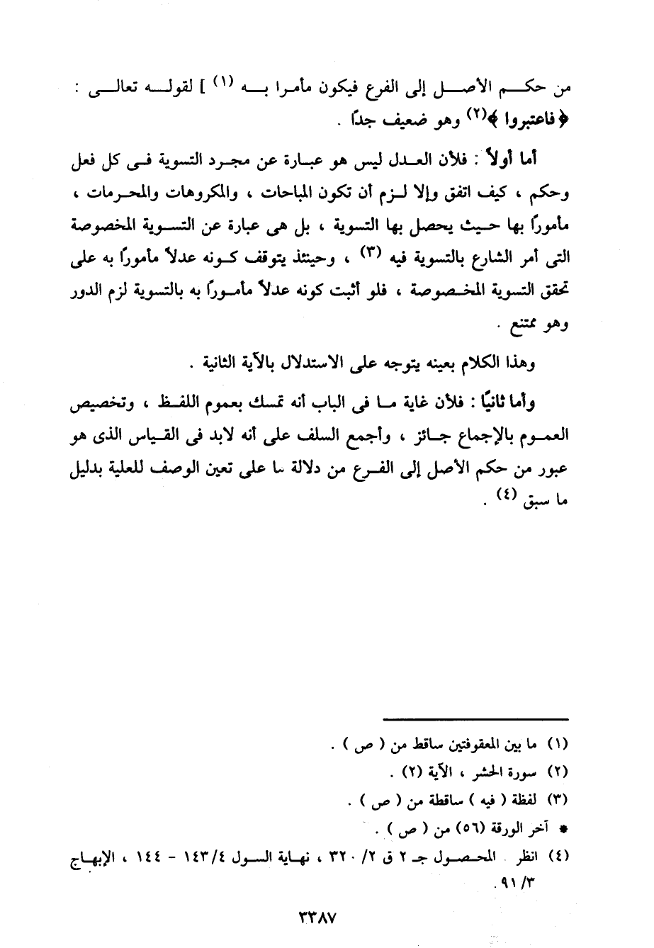 أما أولًا: فلأن العدل ليس هو عبارة عن مجرد التسوية في كل فعل وحكم، كيف اتفق وإلا لزم أن تكون المباحات، والمكروهات والمحرمات، مأمورًا بها حيث يحصل بها التسوية، بل هي عبارة عن التسوية المخصوصة التي أمر الشارع بالتسوية فيه، وحينئذ يتوقف كونه عدلًا مأمورًا به على تحقق التسوية المخصوصة، فلو أثبت كونه عدلًا مأمورًا به بالتسوية لزم الدور وهو ممتنع.
