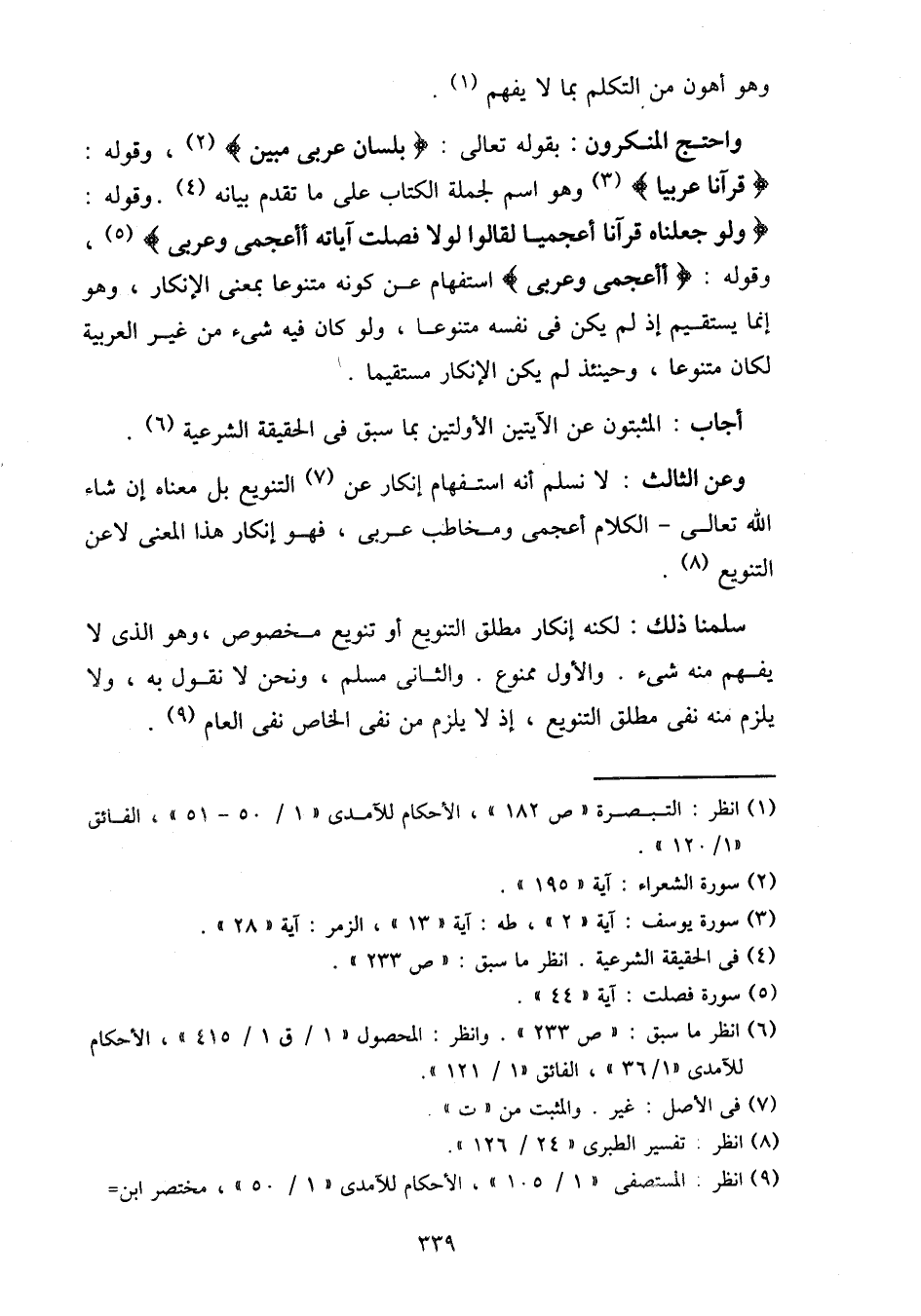 واحتج المنكرون: بقوله تعالى: {بلسان عربي مبين}، وقوله: {قرآنا عربيا} وهو اسم لجملة الكتاب على ما تقدم بيانه. وقوله: {ولو جعلناه قرآنا أعجميا لقالوا لولا فصلت آياته أأعجمي وعربي}، وقوله: {أأعجمي وعربي} استفهام عن كونه متنوعا بمعنى الإنكار، وهو إنما يستقيم إذ لم يكن في نفسه متنوعا، ولو كان فيه شيء من غير العربية لكان متنوعا، وحينئذ لم يكن الإنكار مستقيما.