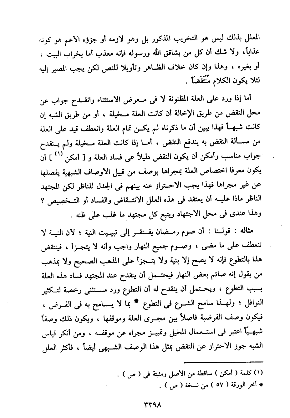 مثاله: قولنا: أن صوم رمضان يفتقر إلى تبييت النية؛ لأن النية لا تنعطف على ما مضى، وصوم جميع النهار واجب وأنه لا يتجزأ، فينتفض هذا بالتطوع فإنه لا يصح إلا بنية ولا يتجزأ على المذهب الصحيح ولا بمذهب من يقول إنه صائم بعض النهار فيحتمل أن ينقدح عند المجتهد فساد هذه العلة بسبب التطوع، ويحتمل أن ينقدح له أن التطوع ورد مستثني رخصة لتكثير النوافل؛ ولهذا سامح الشرع في التطوع بما لا يسامح به في الفرض، فيكون وصف الفرضية فاصلًا بين مجري العلة وموقفها، ويكون ذلك وصفًا شبهيًا اعتبر في استعمال المخيل وتمييز مجراه عن موقفه، ومن أنكر قياس الشبه جوز الاحتراز عن النقض بمثل هذا الوصف الشبهي أيضًا، فأكثر العلل