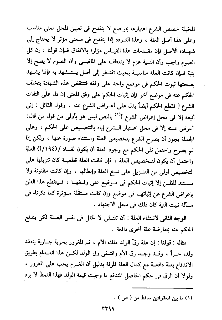 مثاله: قولنا: إن علة رق الولد ملك الأم، ثم المغرور بحرية جارية ينعقد ولده حرًا، وقد وجد رق الأم وانتفي رق الولد لكن هذا انعدام بطريق الاندفاع بعلة دافعة مع كمال العلة المرقة بدليل أن الغرم يجب على المغرور، ولولا أن الرق في حكم الحاصل المندفع لما وجبت قيمة الولد فهذا النمط لا يرد
