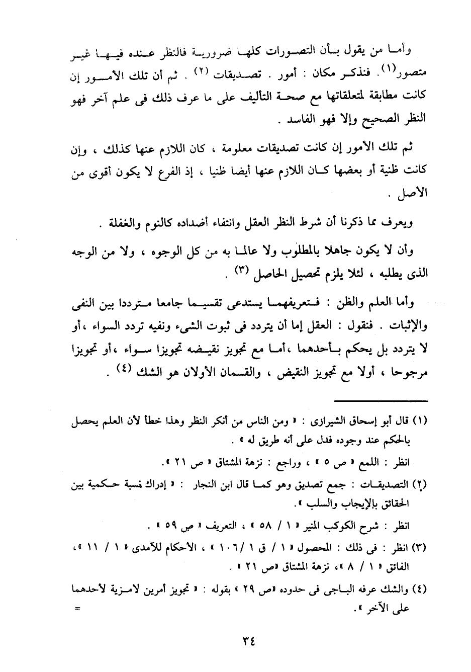 وأما من يقول بأن التصورات كلها ضرورية فالنظر عنده فيها غير متصور. فنذكر مكان: أمور. تصديقات. ثم أن تلك الأمور إن كانت مطابقة لمتعلقاتها مع صحة التأليف على ما عرف ذلك في علم آخر فهو النظر صحيح وإلا فهو الفاسد.