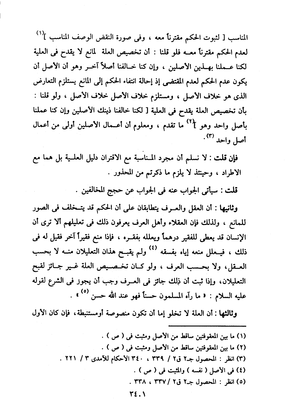 لعدم الحكم مقترنًا معه فلو قلنا: أن تخصيص العلة لمانع لا يقدح في العلية لكنا عملنا بهذين الأصلين، وإن كنا خالفنا أصلًا آخر وهو أن الأصل أن يكون عدم الحكم لعدم المقتضي إذ إحالة انتفاء الحكم إلى المانع يستلزم التعارض الذي هو خلاف الأصل، ومستلزم خلاف الأصل خلاف الأصل، ولو قلنا: بأن تخصيص العلة يقدح في العلية [لكنا خالفنا ذينك الأصلين وإن كنا عملنا بأصل واحد وهو] ما تقدم، ومعلوم أن أعمال الأصلين أولى من أعمال أصل واحد.