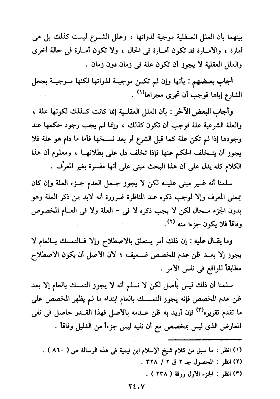 وأجاب البعض الآخر: بأن العلل العقلية إنما كانت كذلك لكونها علة، والعلة الشرعية علة فوجب أن تكون كذلك، وإنما لم يجب وجود حكمها عند وجودها إذا لم تكن علة كما قبل الشرع أو بعد نسخها فغما ما دام هو علة فلا يجوز أن يتخلف الحكم عنها فإذا تخلف دل على بطلانها، ومعلوم أن هذا الكلام كله يدل على أن هذا البحث مبني على أنها مفسرة بغير المعرف.