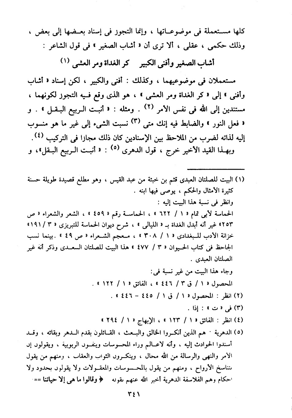 مستعملان في موضوعيهما، وكذلك: أفنى والكبير، لكن إسناد "أشاب وأفنى" إلى "كر الغداة ومر العشي"، هو الذي وقع فيه التجوز لكونهما، مستندين إلى الله في نفس الأمر. ومثله: "أنبت الربيع البقل". و "فعل النور" والضابط فيه إنك متى نسبت الشيء إلى غير ما هو منسوب إليه لذاته لضرب من الملاحظ بين الإسنادين كان ذلك مجازا في التركيب.