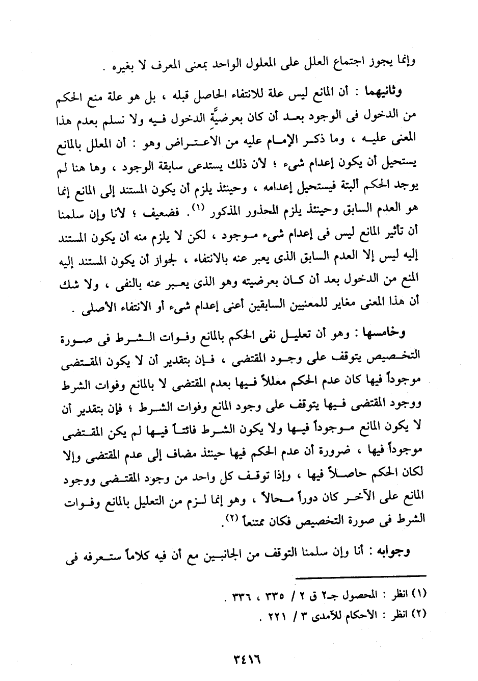 وخامسها: وهو أن تعليل نفي الحكم بالمانع وفوات الشرط في صورة التخصيص يتوقف على وجود المقتضي، فإن بتقدير أن لا يكون المقتضي موجودًا فيها كان عدم الحكم معللًا فيها بعدم المقتضي لا بالمانع وفوات الشرط ووجود المقتضي فيها يتوقف على وجود المانع وفوات الشرط؛ فإن بتقدير أن لا يكون المانع موجودًا فيها ولا يكون الشرط فائتًا فيها لم يكن المقتضي موجودًا فيها، ضرورة أن عدم الحكم فيها حينئذ مضاف إلى عدم المقتضي وإلا لكان الحكم حاصلًا فيها، وإذا توقف كل واحد من وجود المقتضي ووجود المانع على الآخر كان دورًا محالًا، وهو إنما لزم من التعليل بالمانع وفوات الشرط في صورة التخصيص فكان ممتنعًا.