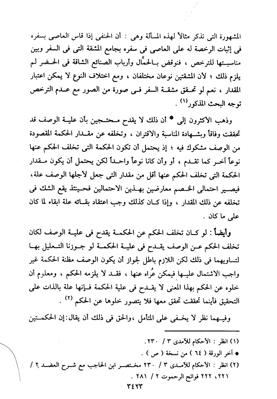 وذهب الأكثرون إلى أن ذلك لا يقدح محتجين بأن علية الوصف قد تحققت وفاقًا وبشهادة المناسبة والاقتران، وتخلفه عن مقدار الحكمة المقصودة من الوصف مشكوك فيه؛ إذ يحتمل أن تكون الحكمة التي تخلف الحكم عنها نوعًا آخر كما تقدم، أو وأن كانا نوعًا واحدًا لكن يحتمل أن يكون مقدار الحكمة التي تخلف الحكم عنها أقل من مقدار التي جعل لأجلها الوصف علة، فيصير احتمالي الخصم معارضين بهذين الاحتمالين فحينئذ يقع الشك في تخلفه عن ذلك المقدار، وإذا كان كذلك وجب اعتقاد بقائه علة ابقاء لما كان على ما كان.