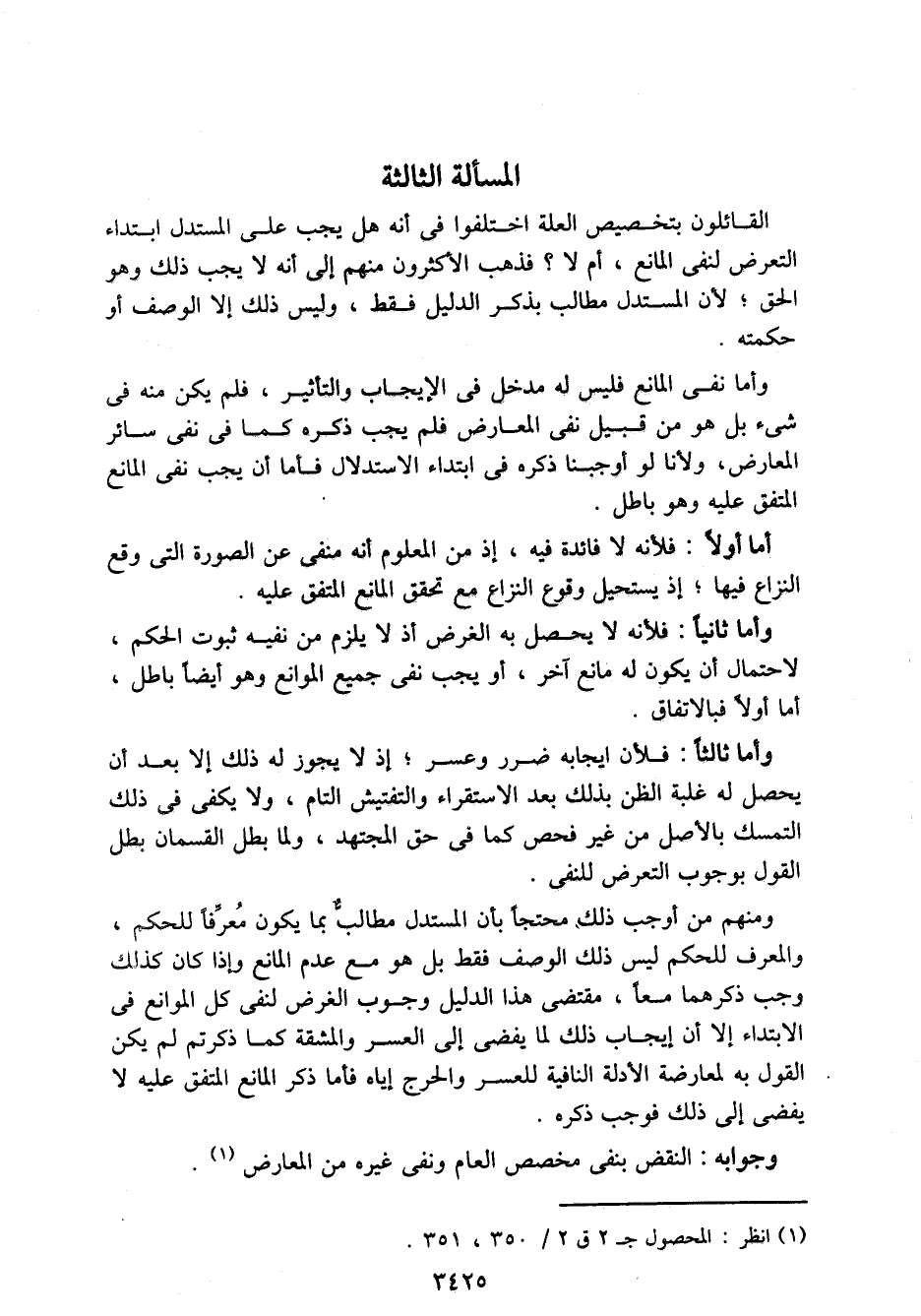 وأما ثالثًا: فلأن ايجابه ضرر وعسر؛ إذ لا يجوز له ذلك إلا بعد أن يحصل له غلبة الظن بذلك بعد الاستقراء والتفتيش التام، ولا يكفي في ذلك التمسك بالأصل من غير فحس كما في حق المجتهد، ولما بطل القسمان بطل القول بوجوب التعرض للنفي.