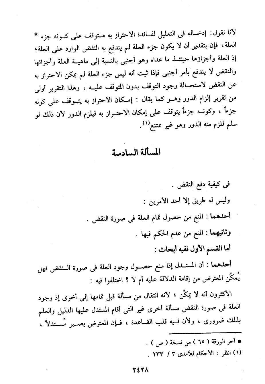 لأنا نقول: إدخاله في التعليل لفائدة الاحتراز به متوقف على كونه جزء العلة، فإن بتقدير أن لا يكون جزء العلة لم يندفع به النقض الوارد على العلة؛ إذ العلة وأجزاؤها حينئذ ما عداه وهو أجنبي بالنسبة إلى ماهية العلة وأجزائها والنقض لا يندفع بأمر أجنبي فإذا ثبت أنه ليس جزء العلة لم يمكن الاحتراز به عن النقض لاستحالة وجود التوقف بدون المتوقف عليه، وهذا التقرير أولى من تقرير إلزام الدور وهو كما يقال: إمكان الاحتراز به يتوقف على كونه جزءًا، وكونه جزءًا يتوقف على إمكان الاحتراز به فيلزم الدور لأن ذلك لو سلم للزم منه الدور وهو غير ممتنع.