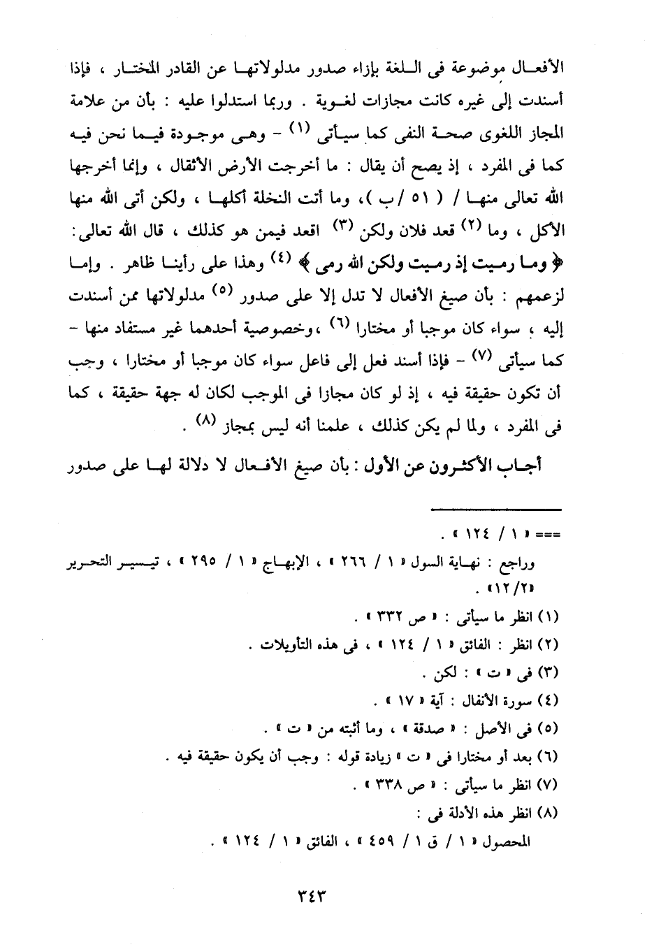 الأفعال موضوعة في اللغة بإزاء صدور مدلولاتها عن القادر المختار، فإذا أسندت إلى غيره كانت مجازات لغوية. وربما استدلوا عليه: بأن من علامة المجاز اللغوي صحة النفي كما سيأتي- وهي موجودة فيما نحن فيه كما في المفرد، إذ يصح أن يقال: ما أخرجت الأرض الأثقال، وإنما أخرجها الله تعالى منها / (51/ب)، وما أتت النخلة أكلها، ولكن أتى الله منها الأكل، وما قعد فلان ولكن اقعد فيمن هو كذلك، قال الله تعالى: {وما رميت إذ رميت ولكن الله رمى} وهذا على رأينا ظاهر. وإما لزعمهم: بأن صيغ الأفعال لا تدل إلا على صدور مدلولاتها ممن أسندت إليه، سواء كان موجبا أو مختارا، وخصوصية أحدهما غير مستفاد منها- كما سيأتي- فإذا أسند فعل إلى فاعل سواء كان موجبا أو مختارا، وجب أن تكون حقيقة فيه، إذ لو كان مجازا في الموجب لكان له جهة حقيقة، كما في المفرد، ولما لم يكن كذلك، علمنا أنه ليس بمجاز.