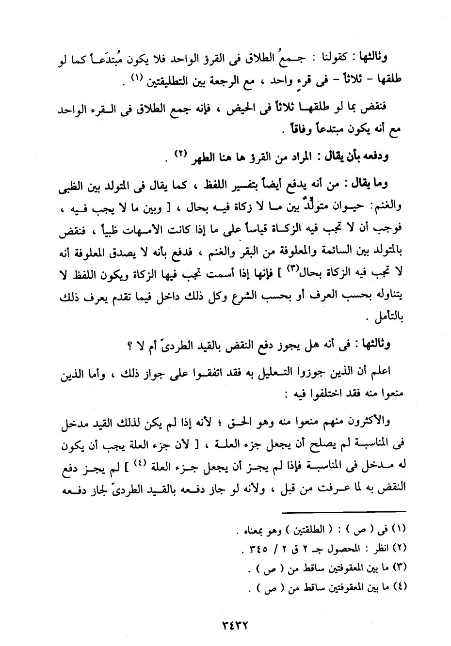وثالثها: كقولنا: جمع الطلاق في القرؤ الواحد فلا يكون مبتدعًا كما لو طلقها- ثلاثًا- في قرء واحد، مع الرجعة بين التطليقتين.