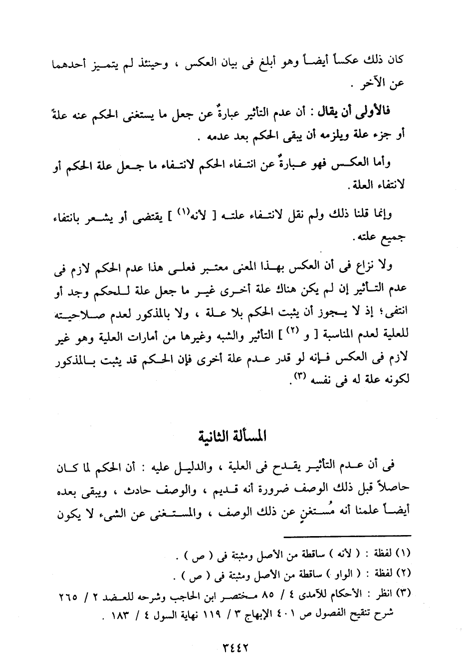 ولا نزاع في أن العكس بهذا المعني معتبر فعلي هذا عدم الحكم لازم في عدم التأثير إن لم يكن هناك علة أخرى غير ما جعل علة للحكم وجد أو انتفي؛ إذ لا يجوز أن يثبت الحكم بلا علة، ولا بالمذكور لعدم صلاحيته للعلية لعدم المناسبة [و] التأثير والشبه وغيرها من أمارات العلية وهو غير لازم في العكس فإنه لو قدر عدم على أخرى فإن الحكم قد يثبت بالمذكور لكونه علة له في نفسه.