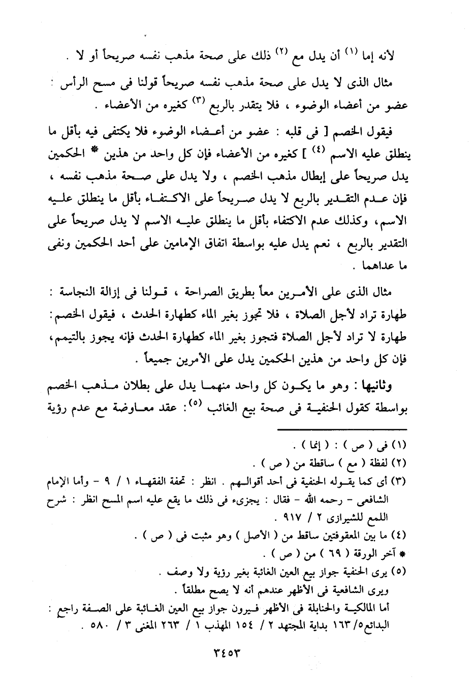 فيقول الخصم [في قلبه: عضو من أعضاء الوضوء فلا يكتفي فيه بأقل ما ينطلق عليه الاسم] كغيره من الأعضاء فإن كل واحد من هذين الحكمين يدل صريحًا على إبطال مذهب الخصم، ولا يدل على صحة مذهب نفسه، فإن عدم التقدير بالربع لا يدل صريحًا على الاكتفاء بأقل ما ينطلق عليه الاسم، وكذلك عدم الاكتفاء بأقل ما ينطلق عليه الاسم لا يدل صريحًا على التقدير بالربع، نعم يدل عليه بواسطة اتفاق الإمامين على أحد الحكمين ونفي ما عداهما.