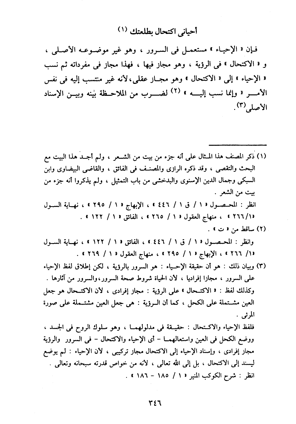 فإن "الإحياء" مستعمل في السرور، وهو غير موضوعه الأصلي، و "الاكتحال" في الرؤية، وهو مجاز فيها، فهذا مجاز في مفرداته ثم نسب "الإحياء" إلى "الاكتحال" وهو مجاز عقلي، لأنه غير منتسب إليه في نفس الأمر "وإنما نسب إليه" لضرب من الملاحظة بينه وبين الإسناد الأصلي.