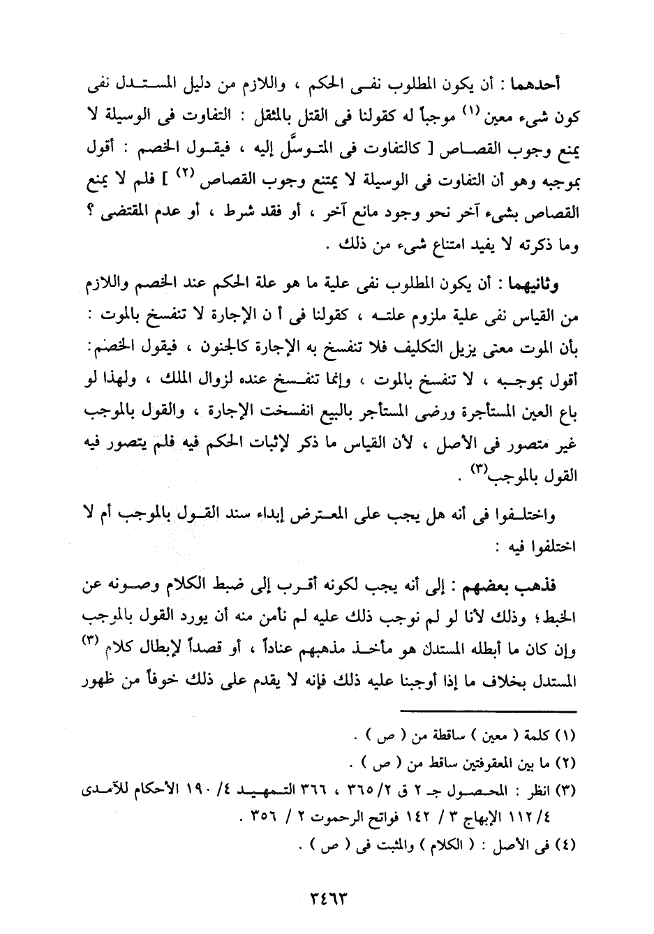 أحدهما: أن يكون المطلوب نفي الحكم، واللازم من دليل المستدل نفي كون شيء معين موجبًا له كقولنا في القتل بالمثقل: التفاوت في الوسيلة لا يمنع وجوب القصاص [كالتفاوت في المتوسل إليه، فيقول الخصم: أقول بموجبه وهو أن التفاوت في الوسيلة لا يمتنع وجوب القصاص] فلم لا يمنع القصاص بشيء آخر نحو وجود مانع آخر، أو فقد شرط، أو عدم المقتضي؟ وما ذكرته لا يفيد امتناع شيء من ذلك.