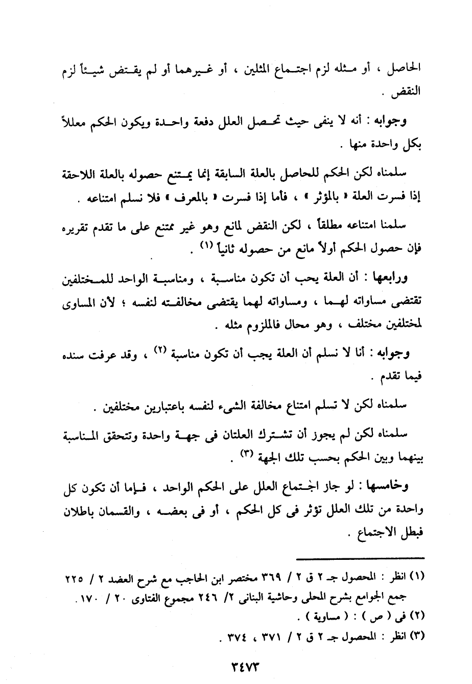 ورابعها: أن العلة يحب أن تكون مناسبة، ومناسبة الواحد للمختلفين تقتضي مساواته لهما، ومساواته لهما يقتضي مخالفته لنفسه؛ لأن المساوي لمختلفين مختلف، وهو محال فالملزوم مثله.
