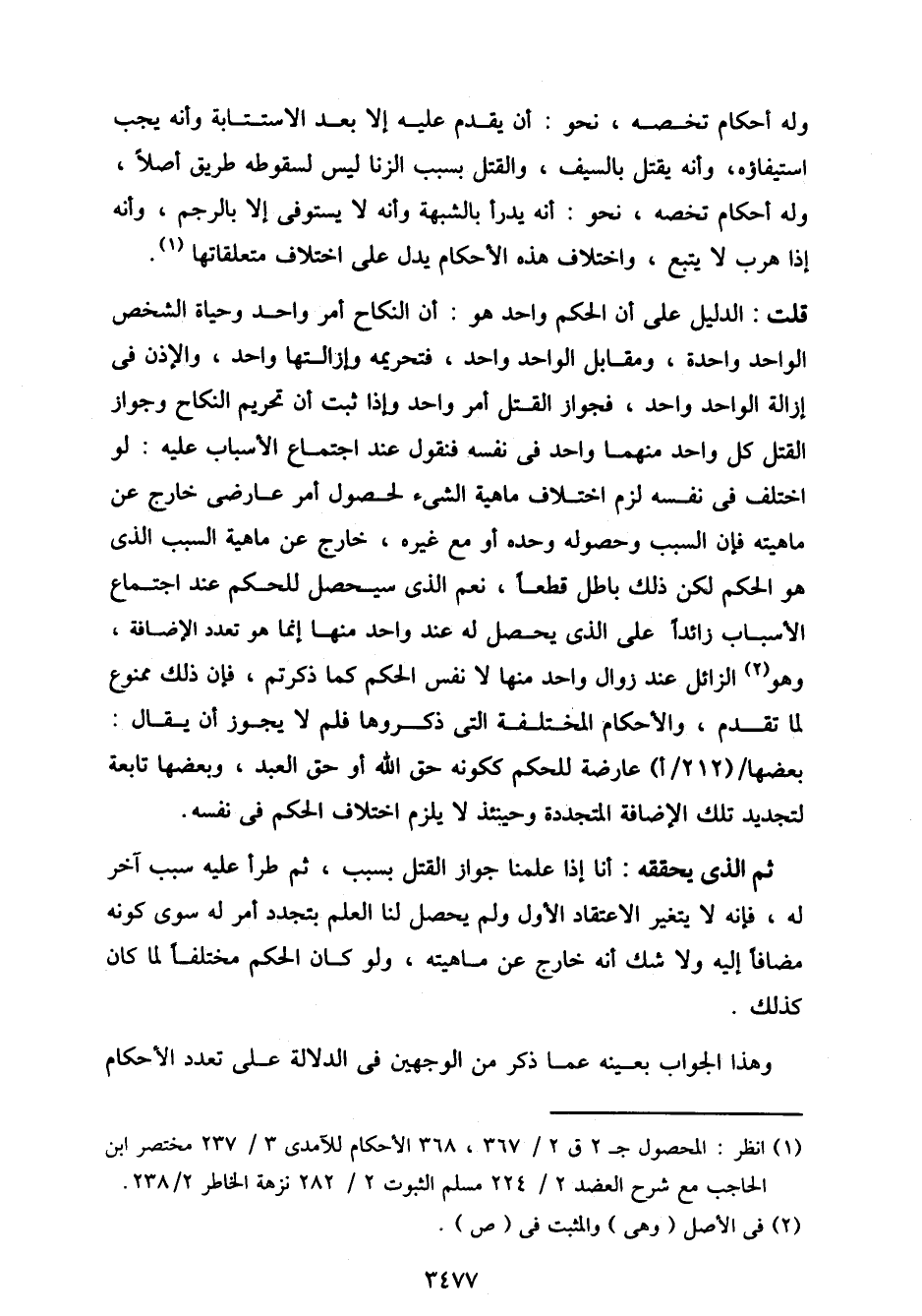 قلت: الدليل على أن الحكم واحد هو: أن النكاح أمر واحد وحياة الشخص الواحد واحدة، ومقابل الواحد واحد، فتحريمه وإزالتها واحد، والإذن في إزالة الواحد واحد، فجواز القتل أمر واحد وإذا ثبت أن تحريم النكاح وجواز القتل كل واحد منهما واحد في نفسه فنقول عند اجتماع الأسباب عليه: لو اختلف في نفسه لزم اختلاف ماهية الشيء لحصول أمر عارضي خارج عن ماهيته فإن السبب وحصوله وحده أو مع غيره، خارج عن ماهية السبب الذي هو الحكم لكن ذلك باطل قطعًا، نعم الذي سيحصل للحكم عند اجتماع الأسباب زائدًا على الذي يحصل له عند واحد منها إنما هو تعدد الإضافة، وهو الزائل عند زوال واحد منها لا نفس الحكم كما ذكرتم، فإن ذلك ممنوع لما تقدم، والأحكام المختلفة التي ذكروها فلم لا يجوز أن يقال: بعضها/ (212/ أ) عارضة الحكم ككونه حق الله أو حق العبد، وبعضها تابعة لتجديد تلك الإضافة المتجددة وحينئذ لا يلزم اختلاف الحكم في نفسه.