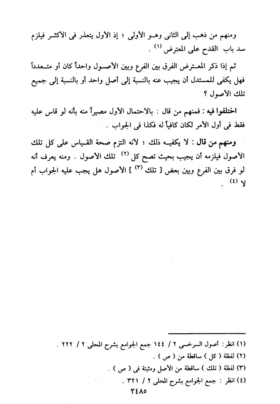 ومنهم من قال: لا يكفيه ذلك؛ لأنه التزم صحة القياس على كل تلك الأصول فيلزمه أن يجيب بحيث تصح كل تلك الأصول. ومنه يعرف أنه لو فرق بين الفرع وبين بعض [تلك] الأصول هل يجب عليه الجواب أم لا.