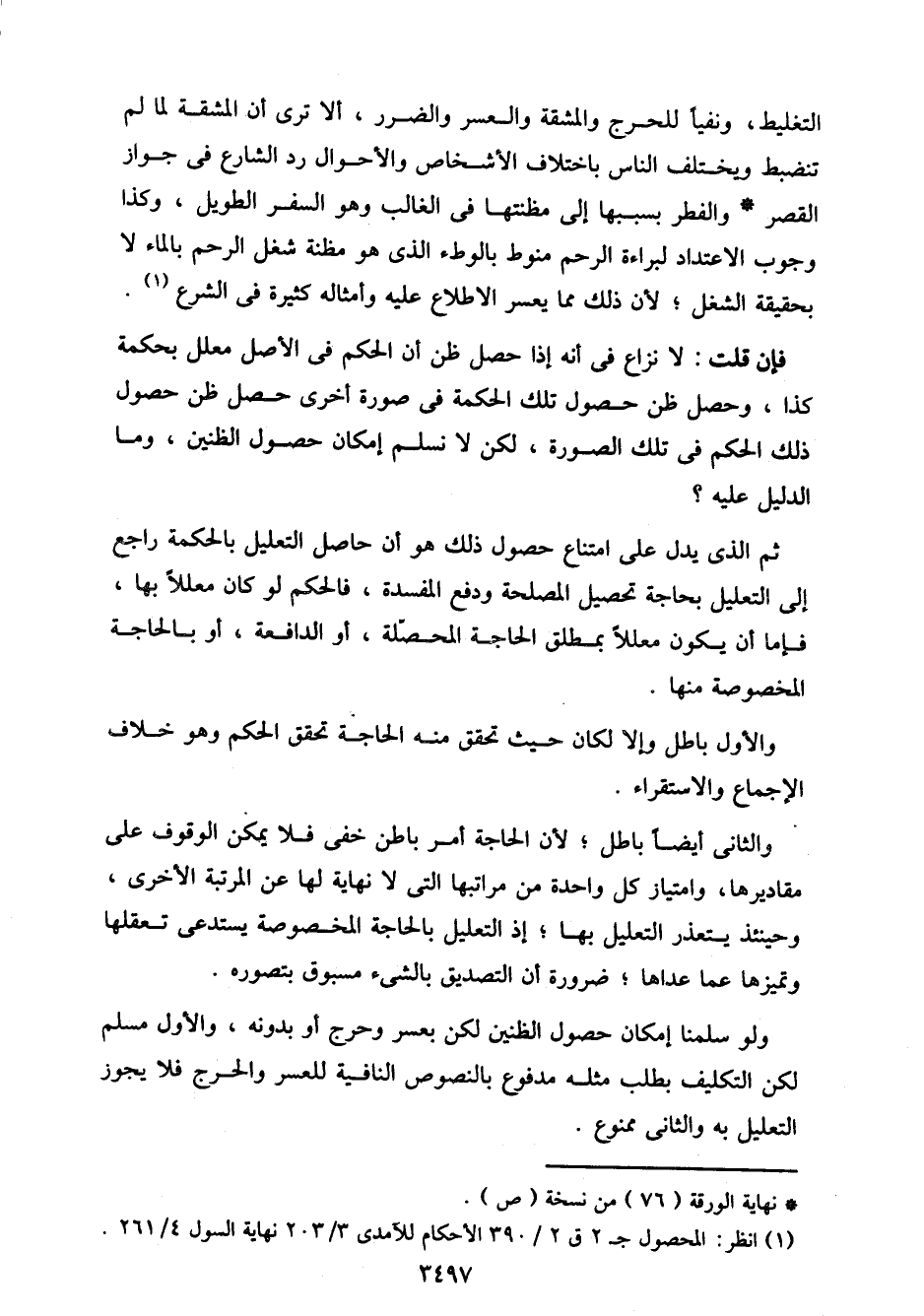 ثم الذي يدل على امتناع حصول ذلك هو أن حاصل التعليل بالحكمة راجع إلى التعليل بحاجة تحصيل المصلحة ودفع المفسدة، فالحكم لو كان معللًا بها، فإما أن يكون معللًا بمطلق الحاجة المحصلة، أو الدافعة، أو بالحاجة المخصوصة منها.